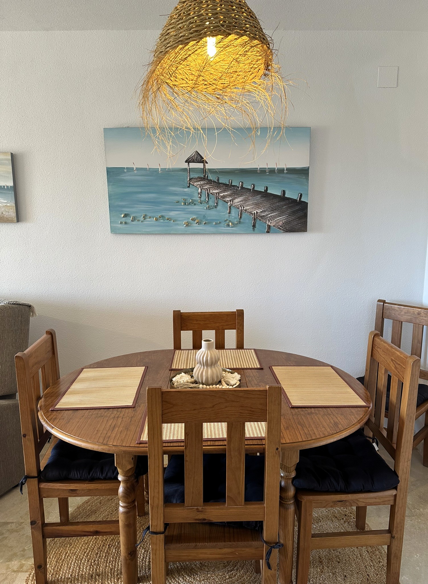 La cocina completamente equipada dispone de un práctico lavadero independiente. El salón, amplio y luminoso, se abre a una gran terraza en esquina, perfecta para relajarse mientras disfrutas de las vistas despejadas a las montañas y a las zonas comunes del residencial, que incluye piscina, césped y pista de tenis.